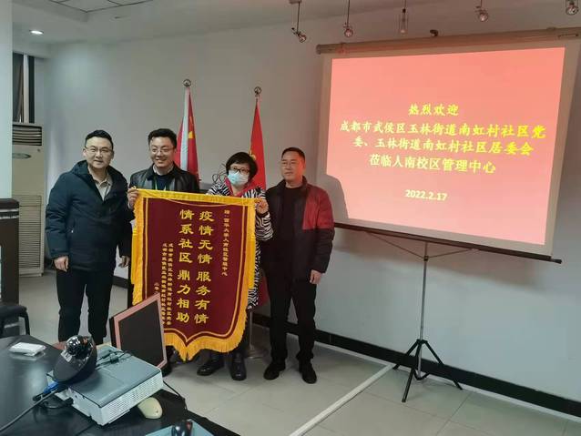 2月17日下午,成都市武侯区玉林街道南虹村社区党委书记梁新燕及社区两委成员一行前来伟德国际1946管理中心交流走访,并向校区赠送了印有“疫情无情 服务有情 情系社区 鼎力相助”字样的锦旗。