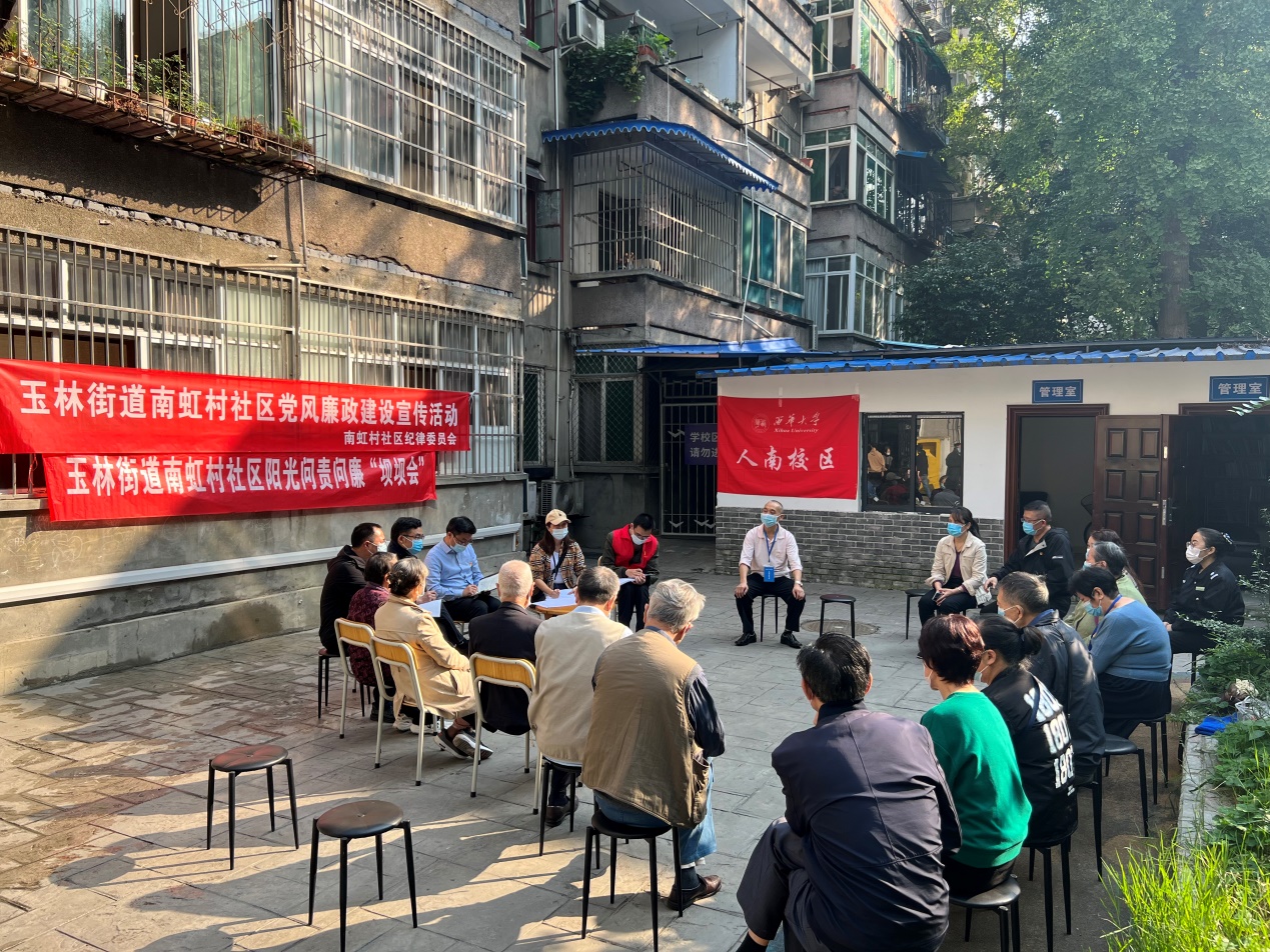 习近平总书记在党的二十大报告中强调“为民造福是立党为公、执政为民的本质要求”。为深入贯彻党的二十大精神,用新时代党的创新理论武装头脑、指导实践、推动工作。10月21日上午,西华大学伟德国际1946管理中心、西华大学社区管理与服务中心联合武侯区玉林街道南虹村社区,在人民南路三段35号院以“阳光问责问廉坝坝会”为载体深入推进“党风廉政建设宣传活动”。相关负责同志及院落居民代表等共计20余人参加。